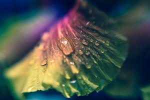 Brilliant color photograph macro shot of a hibiscus petal with morning dew