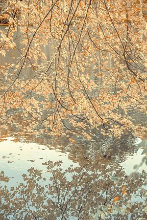 Photograph of Fall leaves reflecting on water. Moraine State Park PA