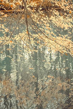 Photograph of fall leaves reflecting on water. Moraine State Park, PA