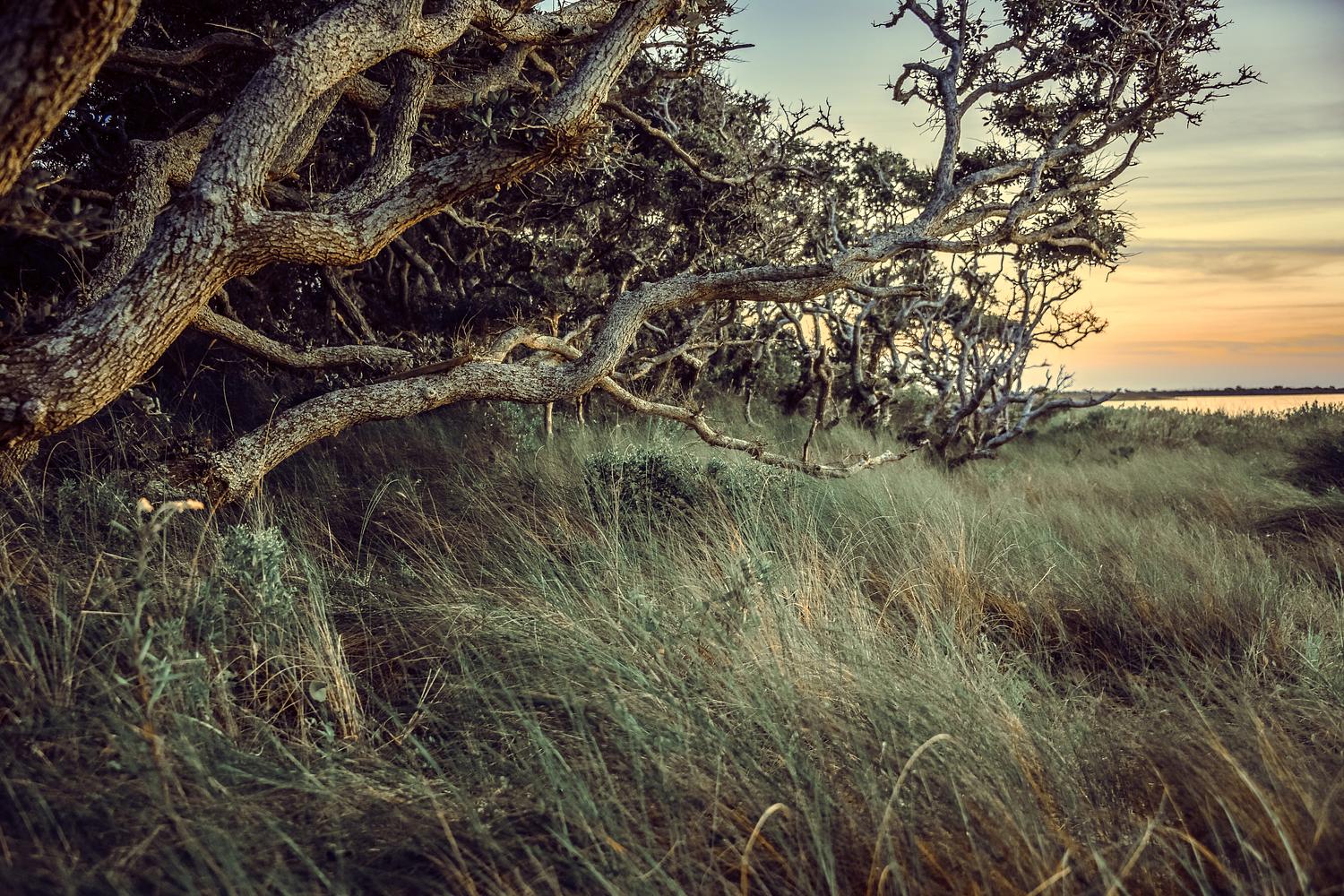Coastal photograph of trees and grass on the sound side of the Outer Banks North Carolina Hatteras Island