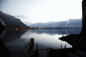 Black and white photograph with city lights in gold reflecting on a lake in Switzerland