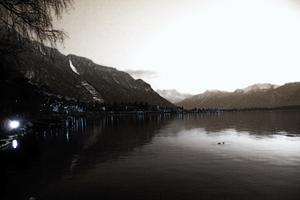 Moody black and white photograph of lake in Switzerland. Blue City lights reflecting on water. Alps in the background.